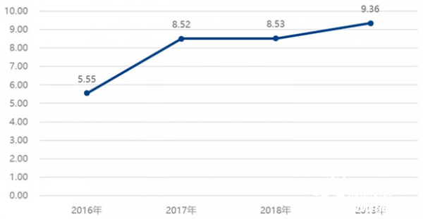 2015~2019年新能源汽車總銷量與公共充電樁保有量比值維持在8上下,2016年后比值緩慢上升。2016年新能源汽車增量與公共充電樁增量的比值為5.55。2017年、2018年維持在8.5,進入2019年上升到9.36。隨著充電市場的日趨成熟,運營企業已經摒棄了跑馬圈地式運營,開始采取按需發展,適當先行的策略,車樁增量比值在增大。